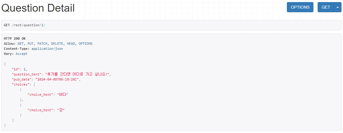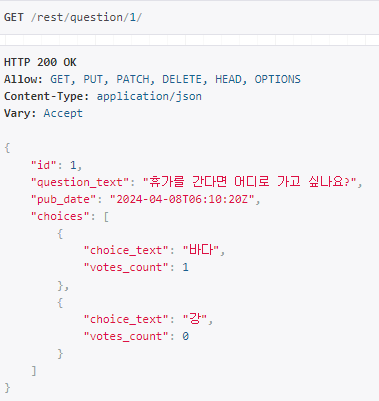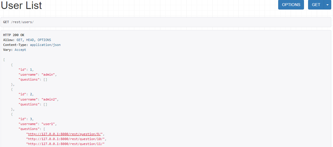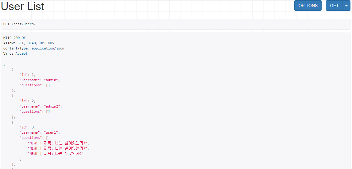 serializers.py의 UserSerializer의 questions를 받아오는 처리에 serializers.StringRelatedField()를 사용하면 Question 모델의 ''__str__'' 메서드 값을 가져올 수 있다.class UserSerializer(serializers.ModelSerializer):