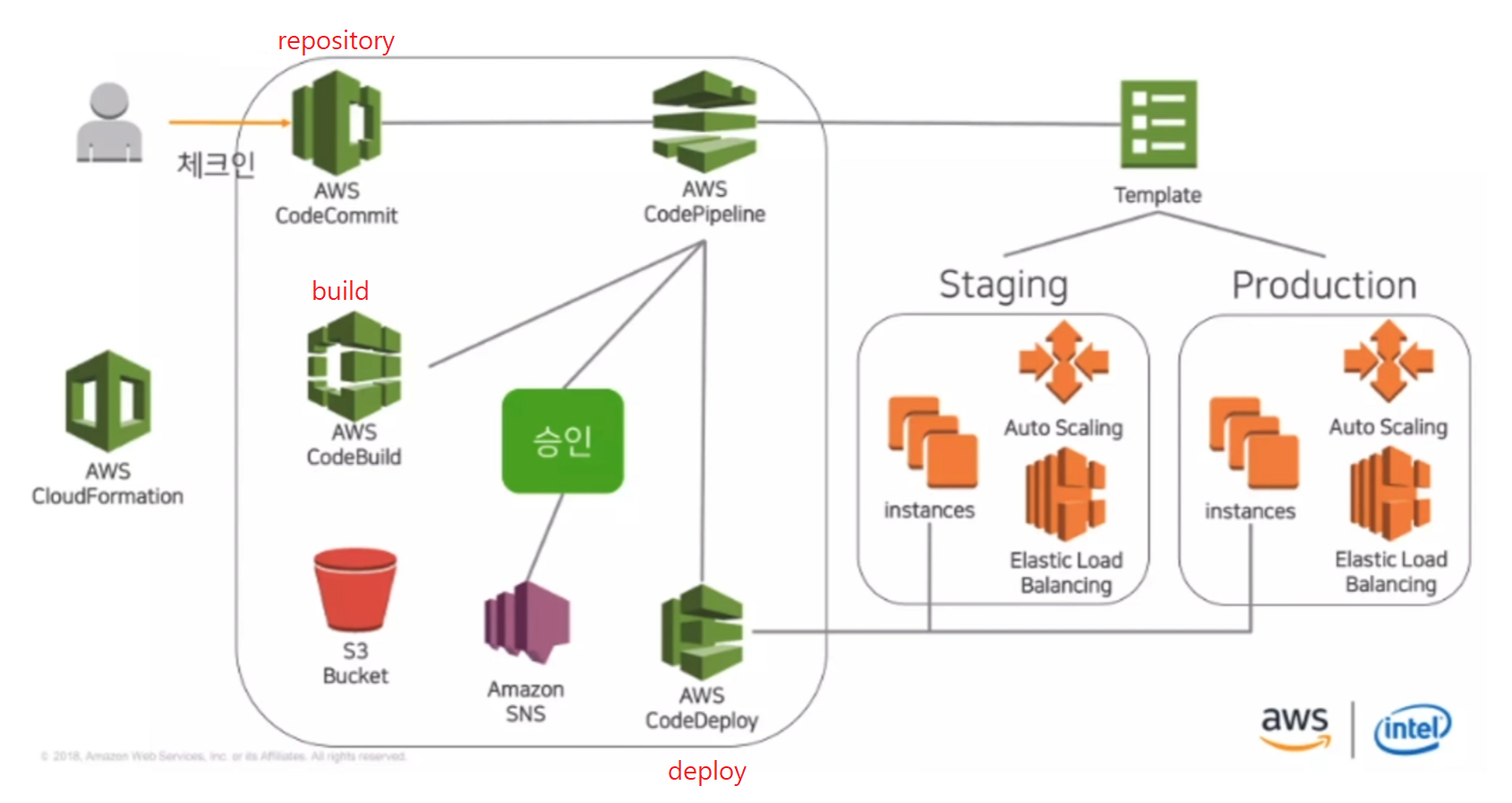 또한 CodeDeploy는 서버에서 실행되고 S3 버킷, Github Repository 또는 Bitbucket Repository에 저장되는 애플리케이션 콘텐츠를 배포 가능하다. 또한 서버리스 Lambda 함수도 배포 가능하고 이를 사용하기 위해 기존 코드를 변경할 필요가 없다는 장점이 있다.