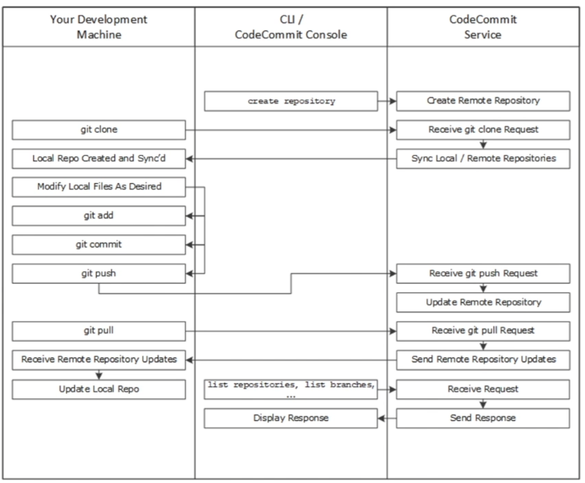 - AWS CodeCommit는 클라우드에서 자산(소스코드, 바이너리 파일)을 비공개로 저장하여 관리하는 데 사용할 수 있도록 Amazon Web Services에서 호스팅되는 버전 관리 서비스. Github의 Repository와 기능이 비슷하다.