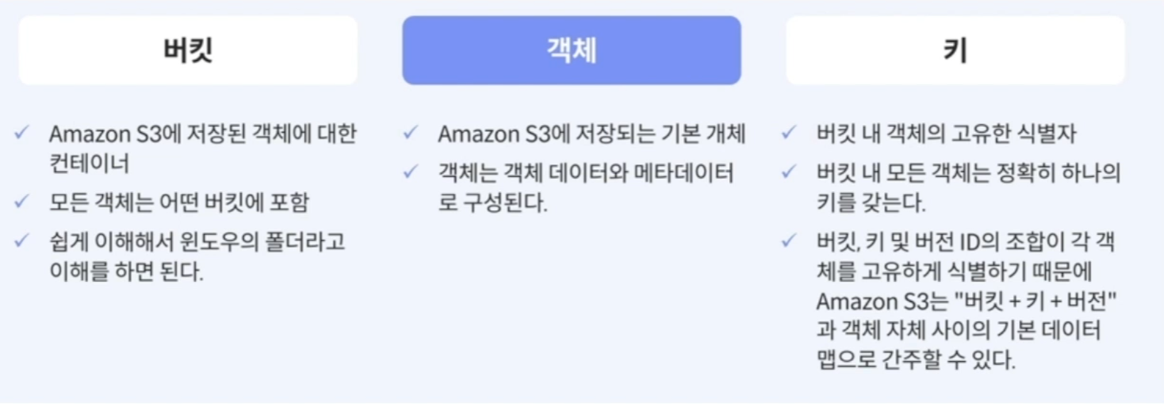 Amazon Simple Storage Service (Amazon S3)는 업계 최고의 확장성, 데이터 가용성, 보안 및 성능을 제공하는 객체 스토리지 서비스이다.