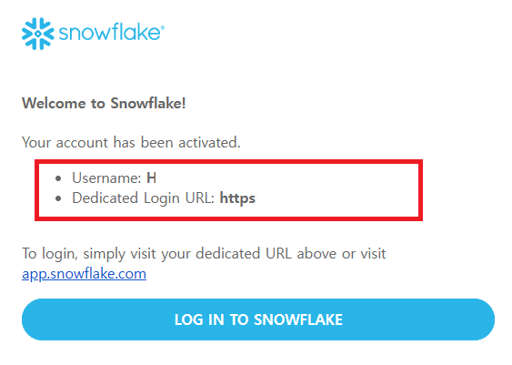 가입을 완료하면 메일로 설정한 Username과 로그인 URL을 확인할 수 있다. 이 정보를 이용해서 Snowflake를 접속해야하므로 별도로 저장하거나 기억해두자.