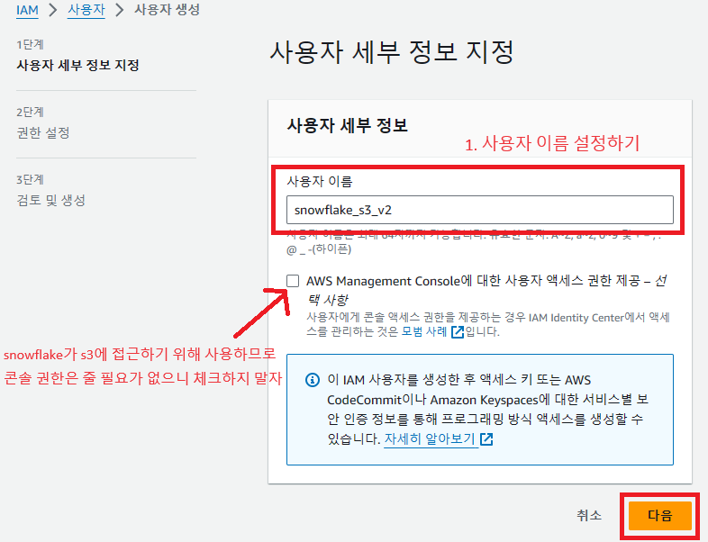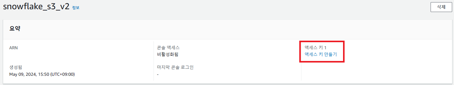 Snowflake는 외부 프로그램이기 때문에 AWS S3 버킷에 접근하기 위해 사용자를 만들어 S3에 접근할 수 있도록 정책을 할당하고 액세스 키를 발급받아야 한다.