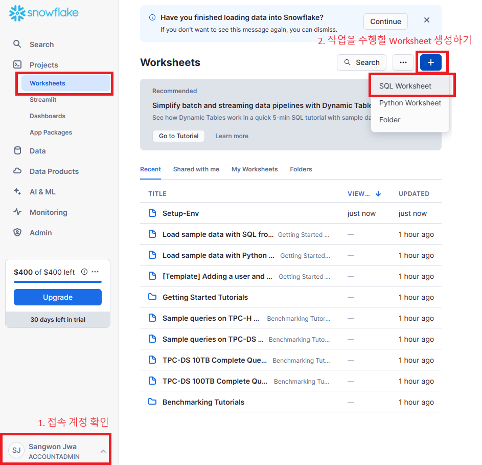 Snowflake는 자체적으로 웹 에디터를 제공하므로 간단하게 SQL문을 실행하고 결과를 출력할 수 있다. 먼저 우리가 SQL문을 실행시키고 작업을 할 Worksheet를 만들자.