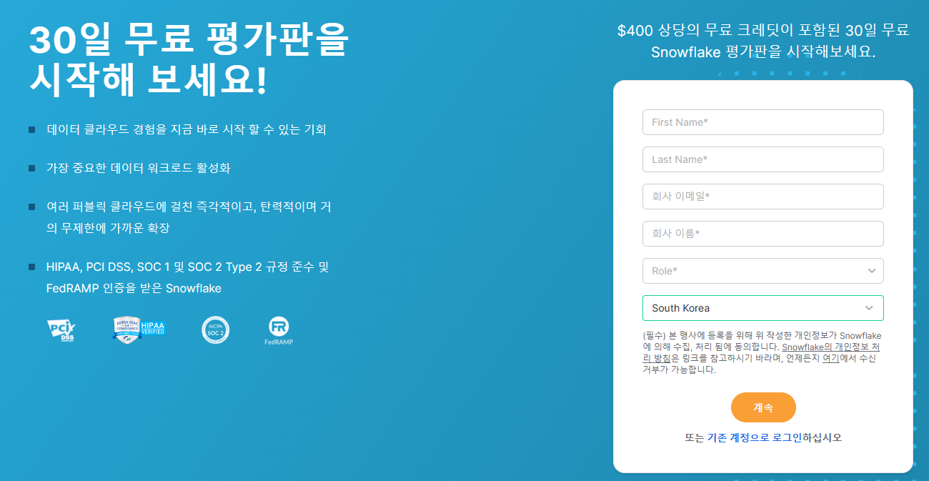 OrganizationsAccountsDatabasesSnowflake는 처음 사용할 시 30일간 400$의 무료 평가판을 이용할 수 있으니 이걸 이용해 보자.