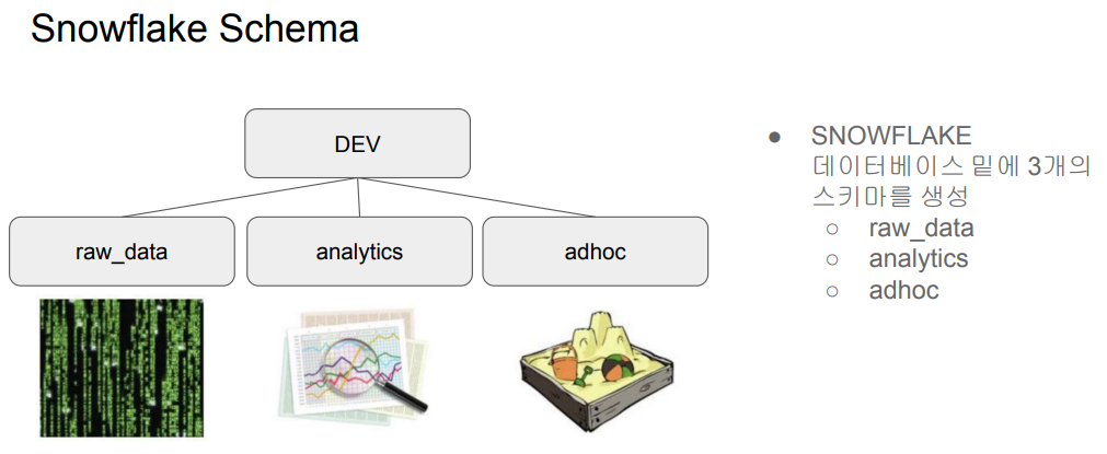 전 실습에서 Redshift에서 테이블을 생성한 것과 마찬가지로 똑같은 구조를 Snowflake를 이용해서 구현해보도록 하자.