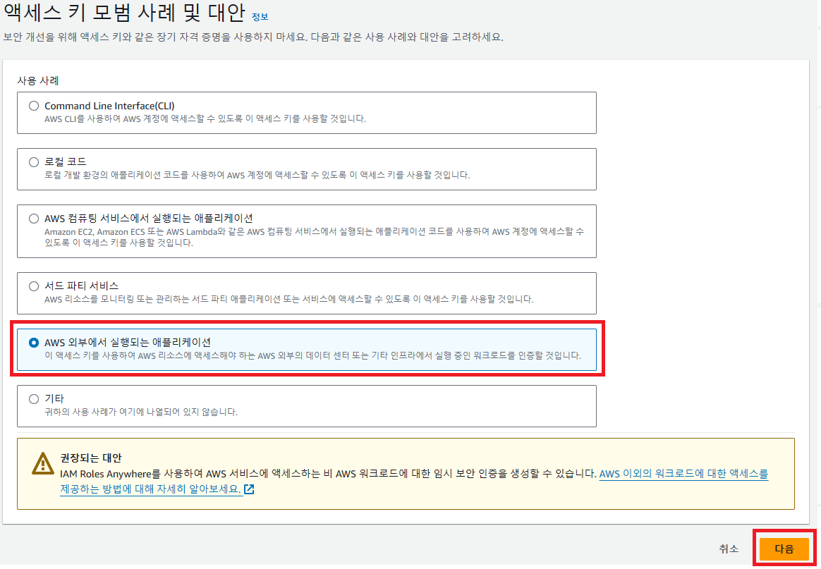 이제 이 사용자에 대한 액세스 키를 발급받아야 한다. 우리는 외부 프로그램에서 사용할 것이기 때문에 'AWS 외부에서 실행되는 애플리케이션' 을 선택해주자.