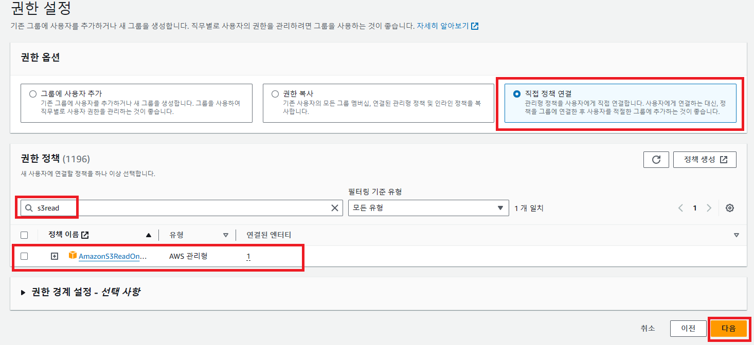 생성한 사용자가 S3에 접근하고 데이터를 읽어올 수 있어야 하기 때문에 'AmazonS3ReadOnlyAccess' 정책을 연결해주고 검토 후 사용자를 생성해주자.