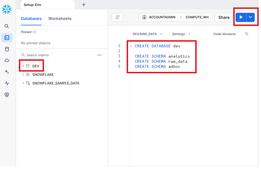 생성한 Worksheet으로 이동하면 SQL을 실행시킬 수 있는 텍스트 에디터를 볼 수 있다. 먼저 dev라는 데이터베이스를 만들고 우리가 만드려는 3가지 스키마를 생성해주자. 완료 시 옆에 DEV 데이터베이스가 생성된 것을 확인할 수 있다.