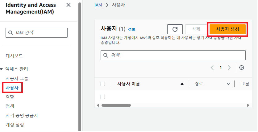 AWS IAM 서비스에서 사용자 탭에 들어가 사용자 생성을 해주자.