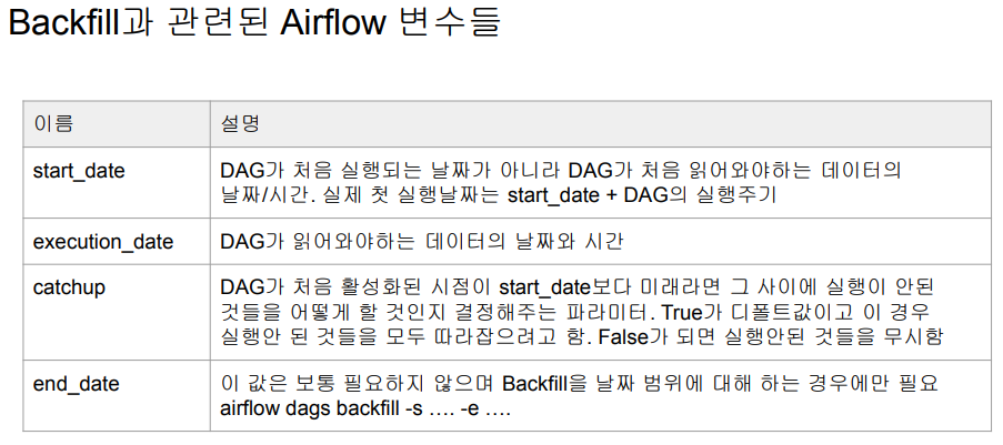 Backfill 이란 실패한 데이터 파이프라인을 재실행 혹은 읽어온 데이터들의 문제로 다시 다 읽어와야하는 경우를 의미한다. Backfill 해결은 Incremental Update에서 복잡해지는데, Airflow에서는 실패한 데이터 파이프라인의 재실행이 잘 디자인되어 있기 때문에 Backfill 문제에서 용이하다.