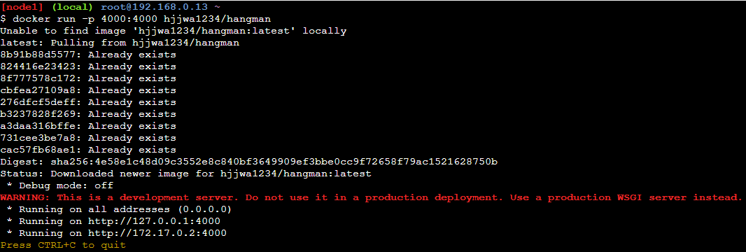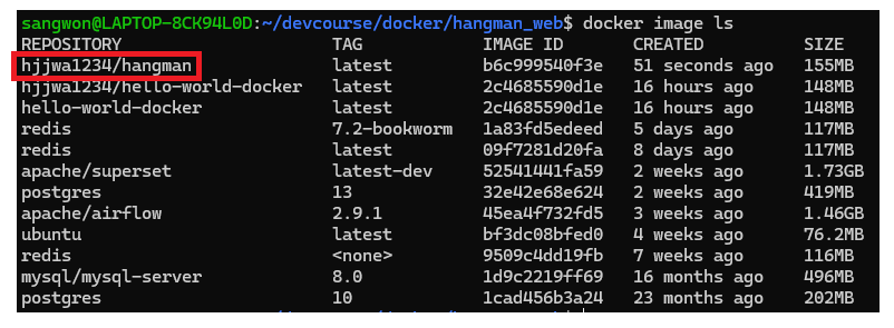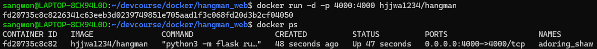 docker run -p 4000:4000 hjjwa1234/hangman 명령어를 사용해서 잘 작동하는지 확인해보자