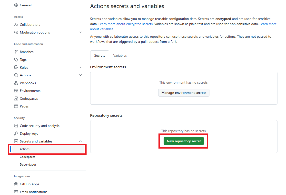 먼저 Docker Hub ID와 PASSWORD를 Github내에 저장해보자. Setting 탭에서 Security 항목의 Secrets and variables를 선택하면 ID와 PASSWORD를 변수로 저장해 놓을 수 있다. YML 파일 안에서는 아래로 접근할 수 있다.