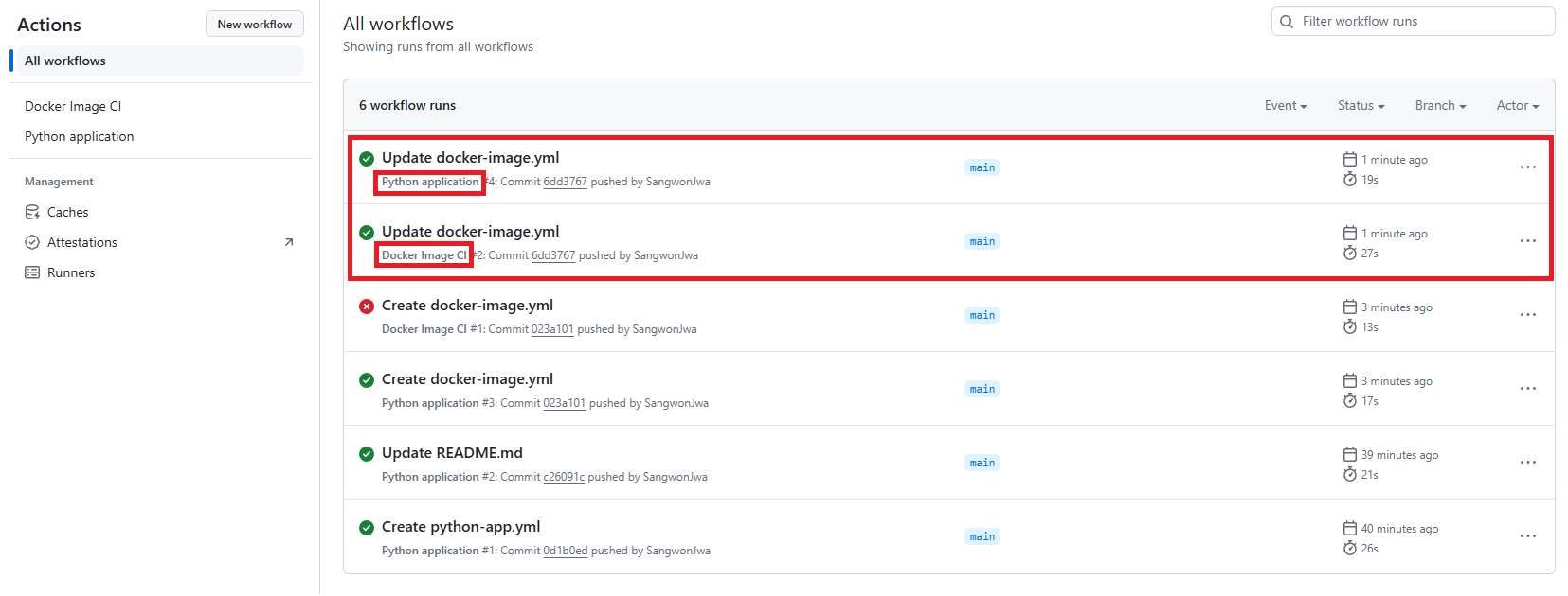 이 Workflow yml파일을 만드는 것도 메인 브랜치에 push를 하는 것이기 때문에 commit changes를 누르면 만든 두가지의 workflow가 작동하는 것을 볼 수 있다.
