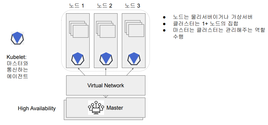 Master는 클러스터를 관리하는 역할을 수행하는 장치로, Master가 없으면 클러스터가 동작하지 않기 때문에 보통 백업을 같이 만들어서 High Availability를 구현한다. High Availability란 어떤 서비스를 두개 이상의 서버로 구성하여 한 서버가 다운되도 계속해서 서비스가 운영되게 하는 것을 말한다. 사용자는 이 Master를 이용해서 Kubernetes의 다양한 기능들을 사용할 수 있다.