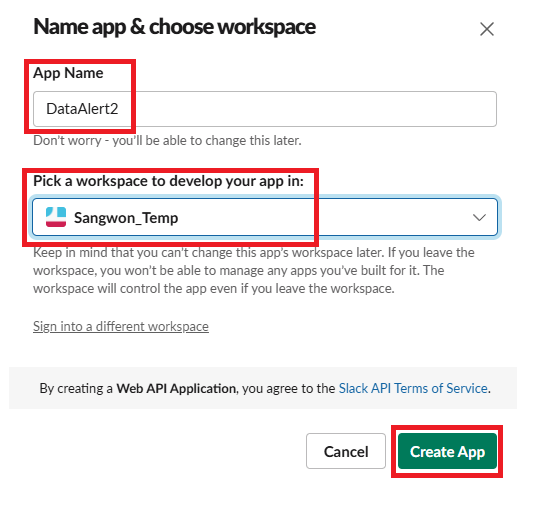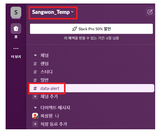 자신이 알림을 받을 Workspace를 정하고 에러 메시지를 받을 channel을 만들어 주자.