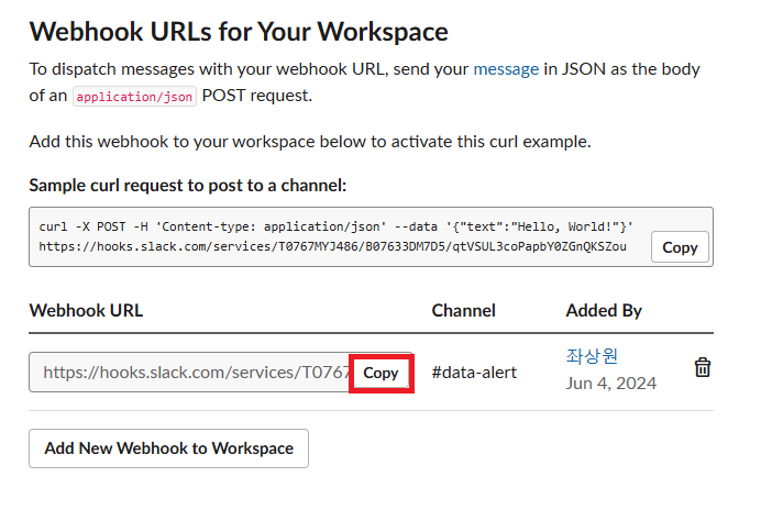 여기 까지 했다면 Workspace에 성공적으로 App이 만들어졌을 것이다. 우의 Sample curl requeest를 터미널해서 실행해보면 data-alert 채널에 Hello, World 메세지가 전송되는 것을 확인할 수 있다.