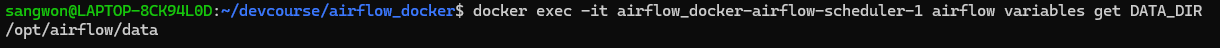 yml 파일에서 환경변수로 설정한 DATA_DIR와 같은 변수는 Web UI에서는 안 보이지만 프로그램에서는 사용가능 하다. 실제로 Admin => Variables 탭에서 우리가 만든 DATA_DIR 변수는 안보이지만 터미널에서 docker exec -it airflow-docker-airflow-scheduler-1 airflow variables get DATA_DIR 명령어를 실행하면 DATA_DIR로 설정한 path가 출력되는 것을 확인할 수 있다.