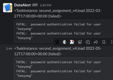이 NameGenderCSVtoRedshift_v4 파일의 DAG를 이제 실행해보면 에러가 발생하고 에러 메시지가 우리가 만든 slack 채널에 전송되는 것을 볼 수 있다.