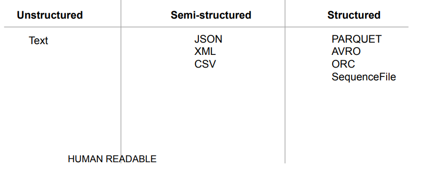 Spark에서 사용하는 주요 파일 타입은 다음과 같다. (PARQUET을 많이 사용)