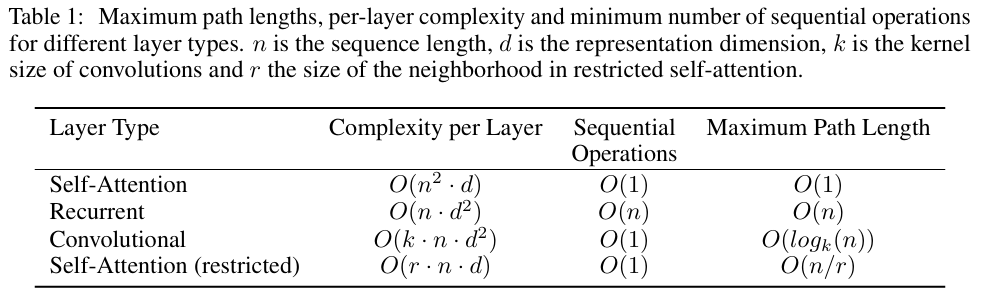 Table.1에서 알 수 있듯이 self-attention layer는 상수 시간안에 모든 position을 연결합니다. Recurrent Layer의 경우에는 이 작업에 O(n)이 소요됩니다. 따라서 일반적인 경우(= n<d) self-attention가 recurrent layer에 비해 빠릅니다.
