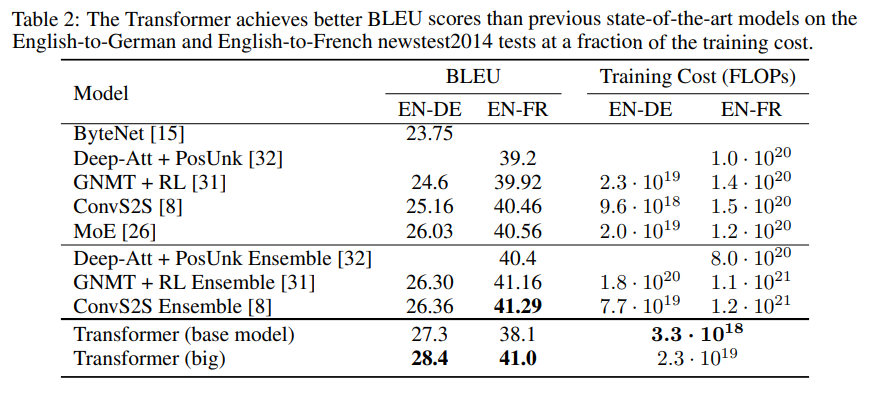 또한, English-to-French 작업에서는 big 모델이 BLEU 점수 41.0을 기록했습니다. 이는 앙상블을 제외한 모델들의 성능을 뛰어넘는 결과이며, 학습 비용 또한 1/4 수준으로 이루어낸 결과입니다.