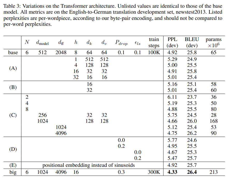 (E) sinusoidal 포지션 임베딩을 학습된 포지션 임베딩으로 대체했고, base 모델과 동일한 성능을 내는 것을 확인했습니다.