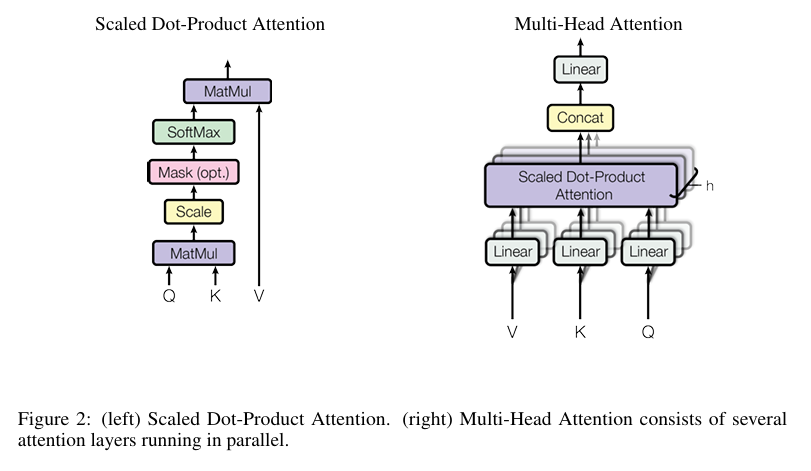 Scaled Dot-Product Attention 의 입력은 dx차원의 Query, Key, 그리고 dv 차원의 Value로 구성됩니다. scaled dot product attention은 모든 Query와 Key의 dot product를 계산한 후, 이를 root(dk)로 나누어 softmax 함수를 적용해 Value에 대한 가중치를 얻습니다. 결과적으로, attention 함수의 output은 value들의 weighted sum으로 계산됩니다.