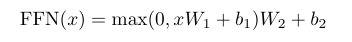 하위 레이어에는 Attention layer 외에도 Fully connected feed-forawrd network가 있습니다. 활성화 함수로는 ReLU를 사용하며, 모두 동일한 구조이나 다른 레이어 간에는 서로 다른 파라미터를 사용합니다.