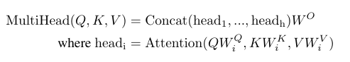 Multi-Head Attention 은 d_model 차원의 단일 어텐션 함수를 수행하기보다, Q, K, V를 h번 서로 독립적으로 학습된 linear projection으로 dk, dk, dv 차원에 linear projection을 수행하는 방식입니다.