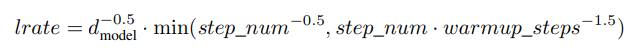 Optimizer는 Adam을 사용했으며, 학습률은 아래 공식에 따라 자동적으로 조정되었습니다. 이는 학습 초반 단계(warmup_steps)동안 학습률을 선형적으로 증가시키고, 이후에는 스텝 번호(step_num)의 역제곱근에 비례하여 감소시키는 방식입니다.