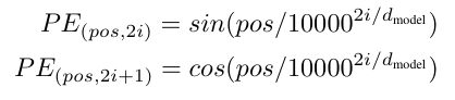 이러한 함수를 선택한 이유는 고정된 offset k에 대해 PE(pos + k)가 PE(pos)의 선형 함수로 표현되어 모델이 상대적인 위치를 잘 학습할 것이라는 가설에 기인합니다.