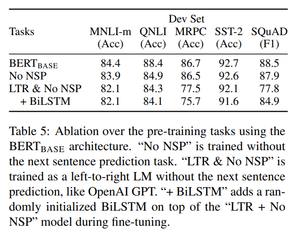 LTR & No NSP에서도 모든 작업에서 MLM 모델보다 성능이 낮고, MRPC·SQuAD에서 성능이 크게 하락하였다.(직관적으로도 SQuAD와 같은 토큰 단위의 예측에서는 오른쪽 context를 보지 못하기 떄문에 불리할 것이다.)