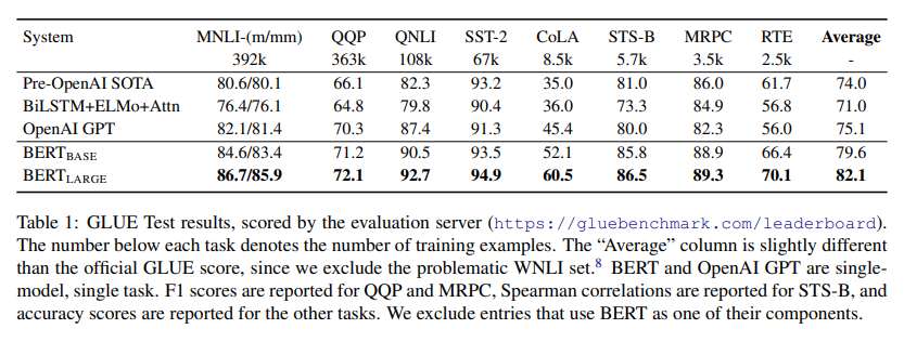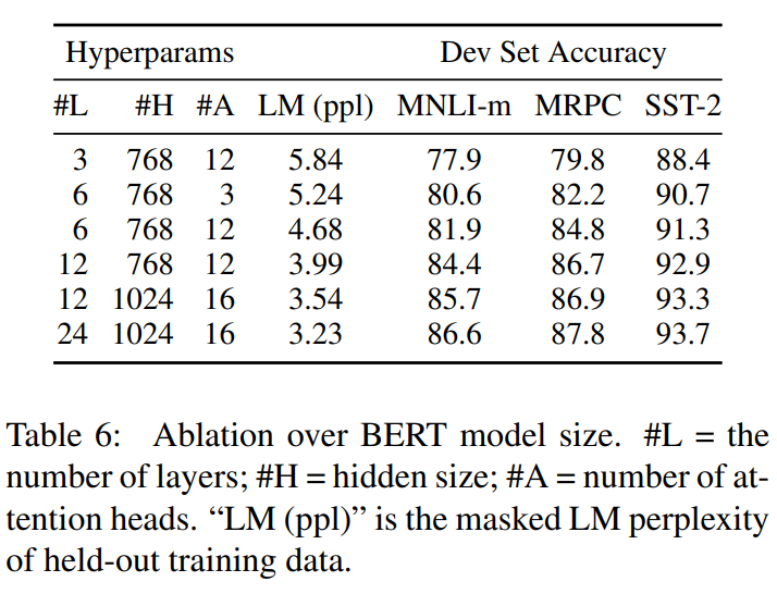 이외에도 BERTLARGE가 대부분 BERTBASE보다 성능이 앞서고, 특히 학습 데이터가 적은 task들에서 큰 폭으로 우세하였다.