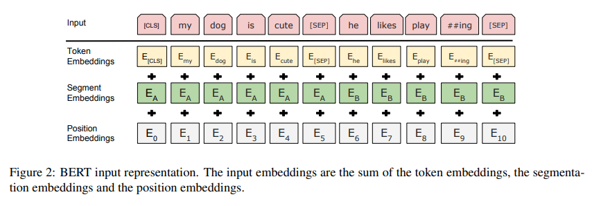 Figure 2에서 보듯이, 각 토큰의 input representation은 toekn embedding(토큰에 대한 임베딩), segment embedding(문장이 A/B 어느 쪽에 속하는지 알려주는 벡터), position embedding(토큰의 위치)을 더하여 구성한다.