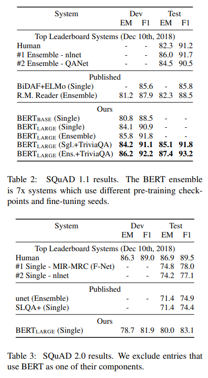 연구자들은 소량의 추가 학습 데이터를 위해 TriviaQA(Joshi et al., 2017)로 먼저 미세 조정 후 SQuAD에 fine-tuning하였으며, 단일 BERT 모델이 당시 최고 앙상블 시스템보다도 F1 score가 높음을 보였다.