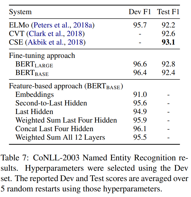 CoNLL-2003 Named Entity Recognition(NER) task로 실험한 결과, Feature-based 접근에서도 BERT는 매우 강력하며 Top 4 계층의 은닉 상태를 연결(Concat)한 것이 Fine-tuning 대비 단 0.3 F1 낮음을 보였다.
