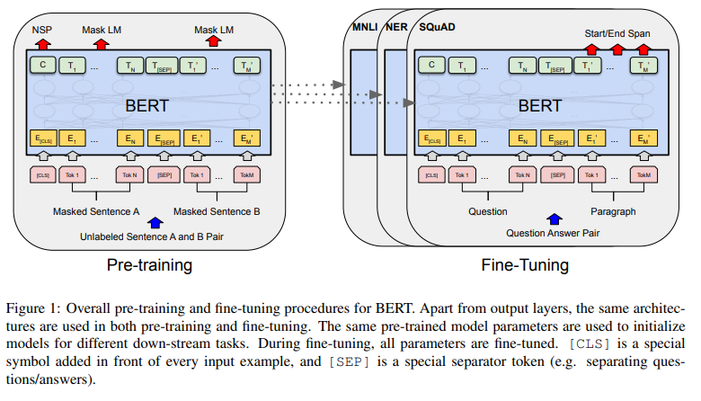 BERT는 두 가지의 unsupervised learning을 통해 pre-training을 하는데, 이는 Figure 1의 왼쪽에 해당하는 단계이다.
