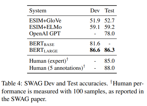 BERTBASE와 BERTLARGE가 모두 기존 작업에 대해 SOTA를 크게 앞서는 것을 알 수 있다. 그리고 공식 GLUE 리더보드에서 BERTLARGE의 점수는 80.5로 동일 시점의 GPT의 점수 72.8을 크게 앞섰다.