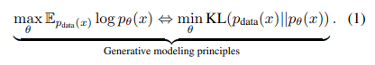 좌측의 식은 최대 우도 측정(MLE)이라는 방식입니다. 주어진 데이터 분포 P_data을 이용해 모델의 분포 P_theta와 실제 데이터 분포 P_data가 최대한 비슷해지도록 학습하여 Theta를 최적화합니다.