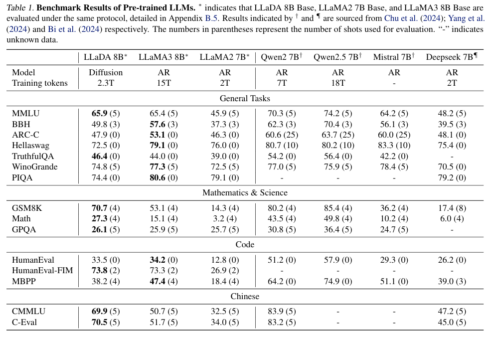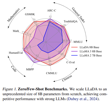 Table.1에서 LLaDA 8B는 LLaMA 8B와 전반적으로 비슷한 성능을 보이며, LLaMA2 7B를 능가하는 성능을 보입니다.