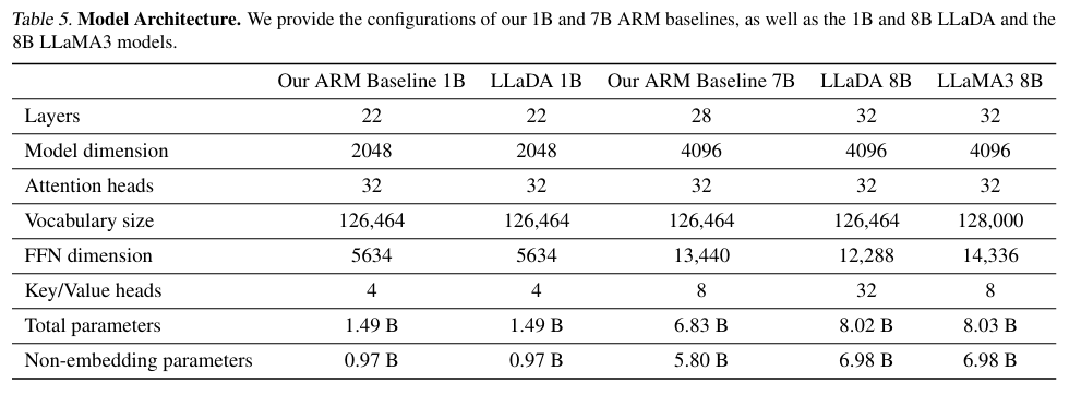 더 큰 스케일에서는 LLaDA와 ARM 모델이 리소스 제한으로 인해 약간 다른 크기로 훈련되었습니다. 해당 내용이 부록 B.2에 자세히 수록되어있습니다.