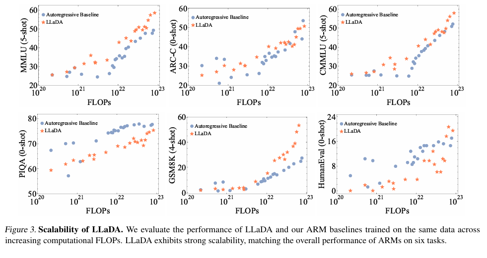Fig.3을 보면 LLaDa는 ARM과 비교해도 상당히 괜찮은 성능을 보이며, scalability 또한 인상적으로 보입니다.