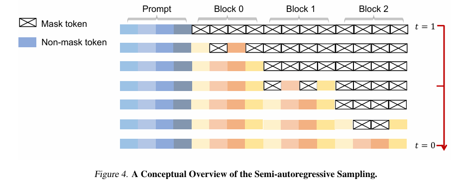 다른 하나는 Semi-Autoregressive Remasking으로 sequence를 블록 단위로 나누어 좌->우로 생성하는 것입니다.