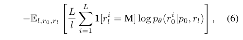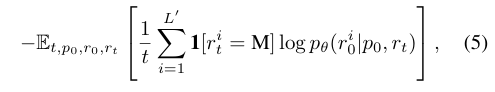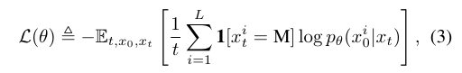 수식을 자세히 살펴보면 는 에서의 기댓값을 의미합니다. 는 원본 텍스트, 는 Forward Process를 거쳐 마스킹된 결과물, t는 마스킹 비율입니다. 이때 t는 [0,1] 범위의 uniform distribution을 가집니다.