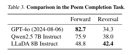 대신, LLaDA는 역방향 생성에서 타 ARM 기반 모델들의 성능을 능가합니다.