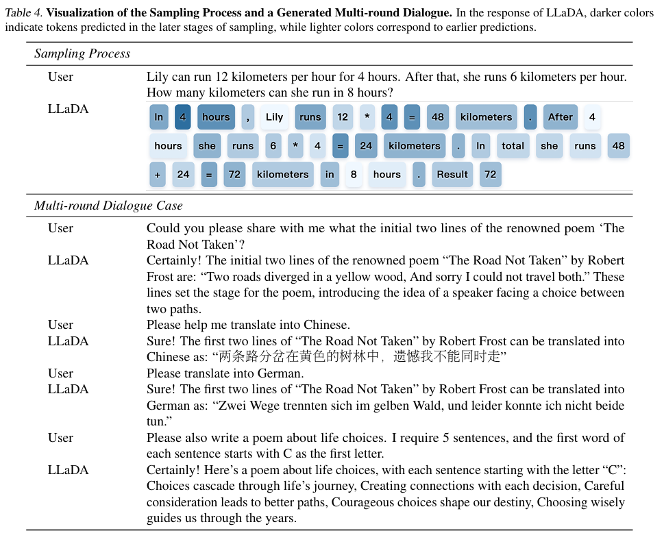 1. 이는 LLaDA가 auto-regression을 사용하지 않은 방식으로도 일관되고 유창한 텍스트를 생성할 수 있음을 보여줍니다.
