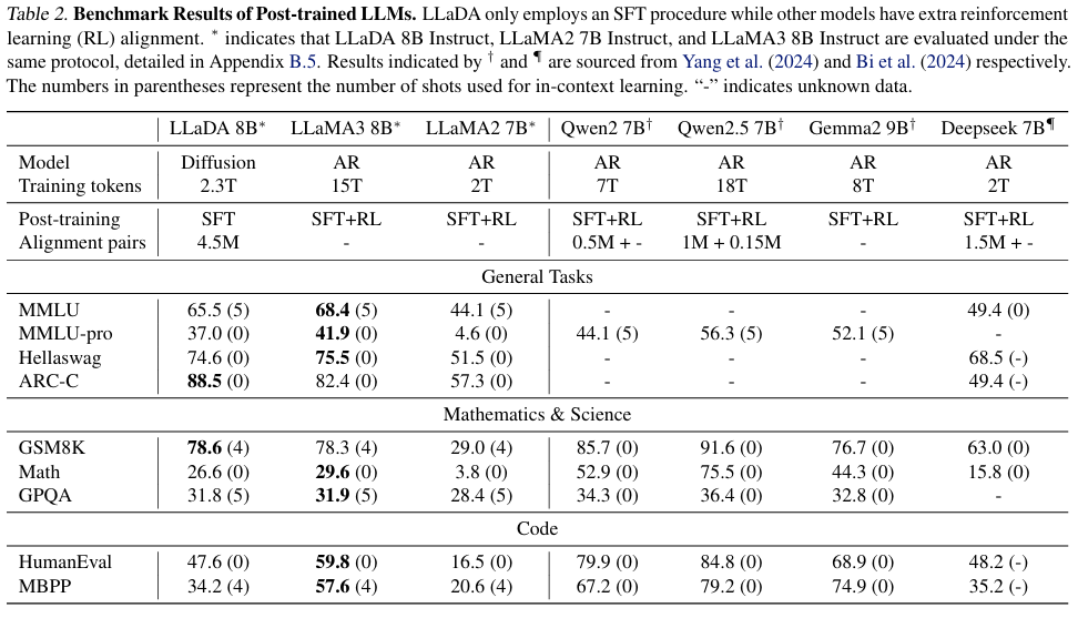 AR 기반 모델들은 Post-training에 SFT와 RL을 사용하는 반면, LLaDA는 SFT만을 사용하였습니다.