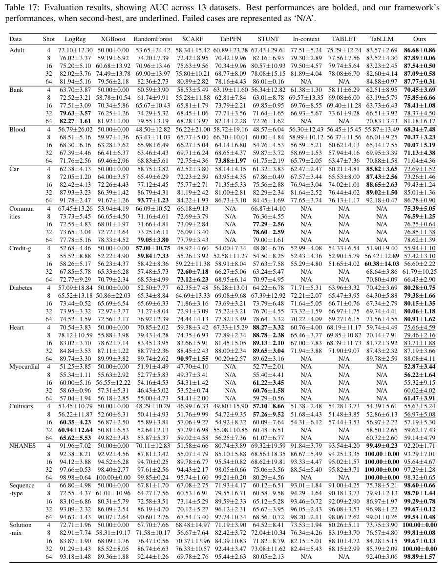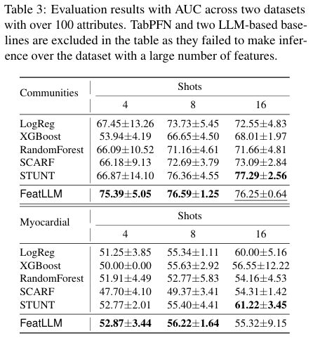 in-context learning, TABLET, TabLLM과 같은 LLM을 사용하는 모델은 피쳐의 개수가 많은 데이터셋(Communities, Myocardial. Table.3 참조)에서 성능이 낮게 나왔습니다.