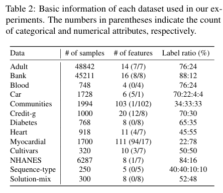 각 데이터셋의 자세한 특성은 위와 같습니다. 왼쪽부터 차례대로 샘플의 개수, 피쳐의 개수(괄호 안의 비율은 각각 categorical/numerical 피쳐의 개수이다), 레이블의 비율입니다.