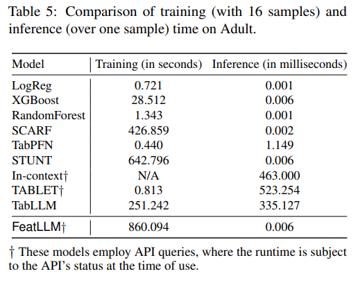 이번에는, 다양한 모델간의 학습 시간과 추론 시간을 비교했습니다. 해당 실험은 Adult 데이터셋(16-shot)에서 수행되었습니다.